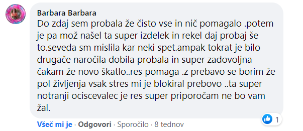Že odkar pomnim imam slabo prebavo. Preizkusila sem že veliko različnih stvari, ki so stale veliko denarja in nobena ni delovala dolgo – probiotiki, encimi itd. Odkar pa sem začela jemati Super notranji očiščevalec+ 3x na dan so se zadeve uredile. Počutim se veliko bolje in moje celotno telo zdaj deluje bolje! Izdelek zelo priporočam.