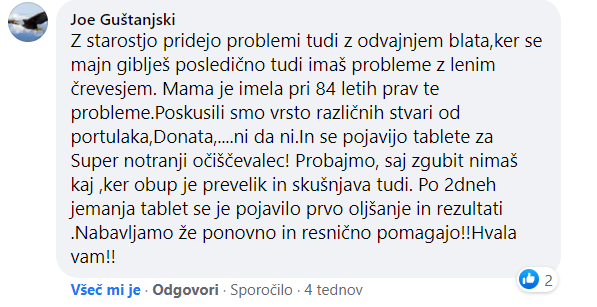 Moje težave s prebavo so se začele izboljševati zelo hitro. Že po nekaj dnevih uporabe Super notranjega očiščevalca+ šlo veliko lažje. Na stranišču je bila poezija. Ne spomnim se, kdaj sem se nazadnje počutil tako lahko in nenapeto.